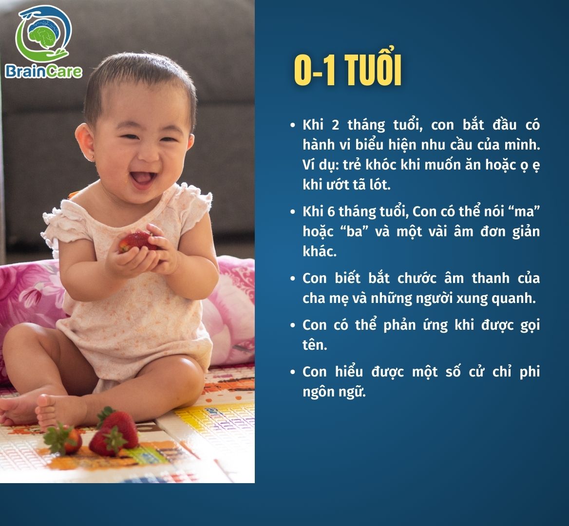 0-1 tuổi: Con biết nói bập bẹ, hoặc phát âm một số từ đơn giản như “ba” hoặc “mẹ”.