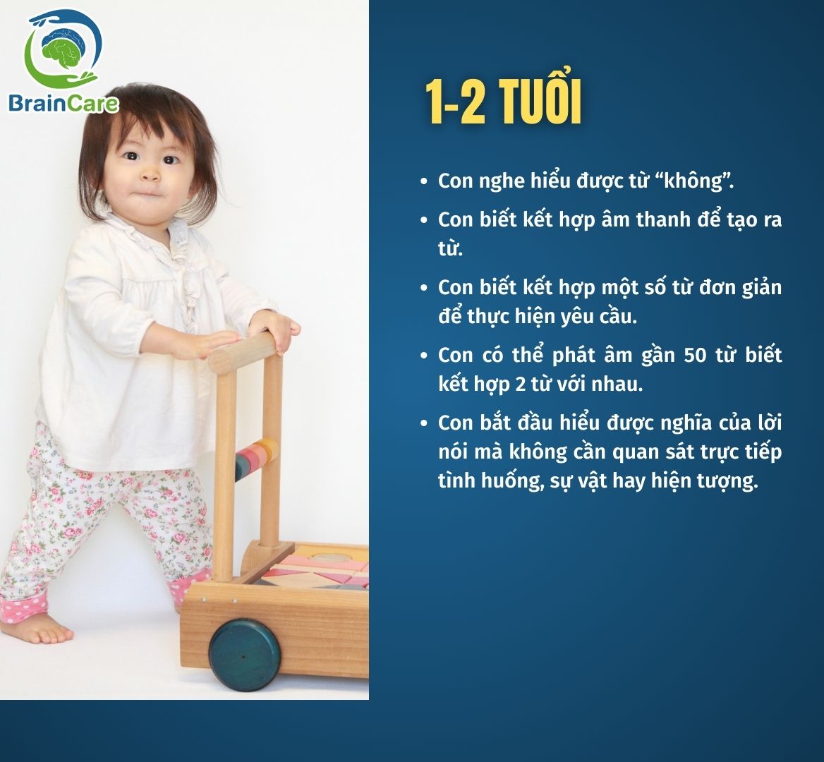 1-2 tuổi: Con biết cách thể hiện nhu cầu đơn giản của bản thân bằng một số từ đơn giản hoặc bằng ngôn ngữ cơ thể như chỉ tay, tương tác mắt.