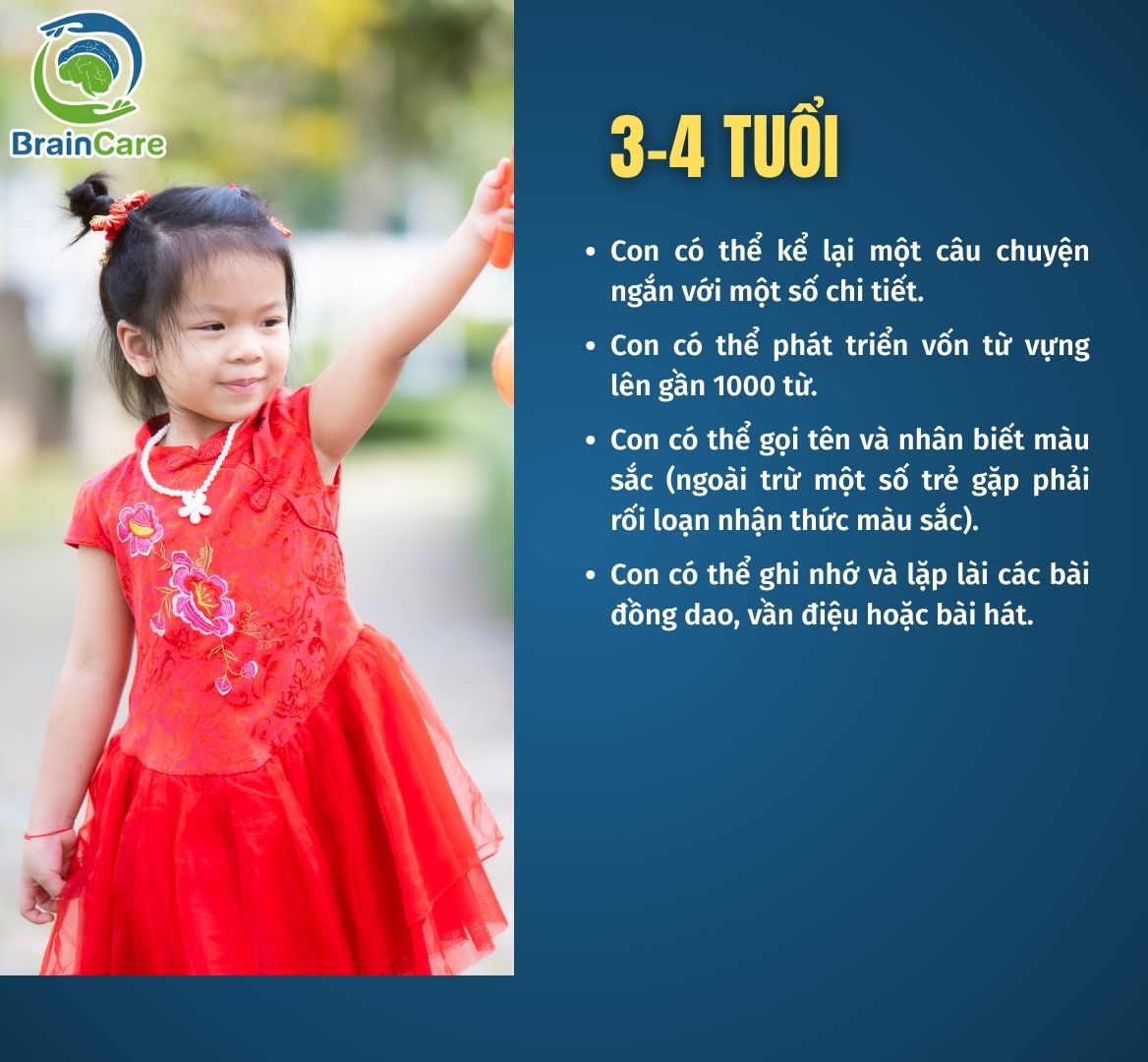 3-4 tuổi: Con có thể kể lại một câu chuyện ngắn với một số chi tiết, hoặc ghi nhớ được các bài đồng dao, vần điệu nào đó.