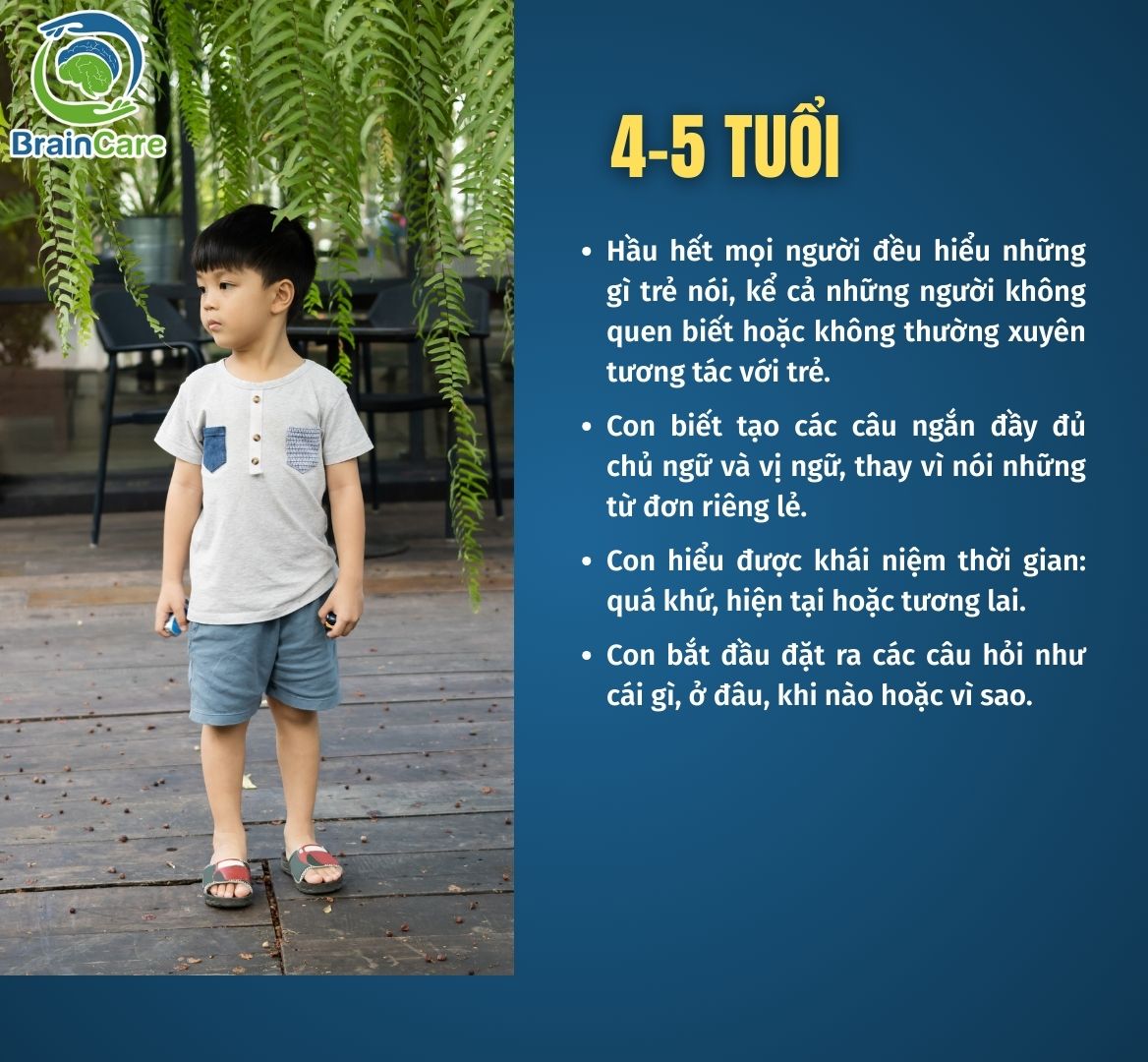 4-5 tuổi: Con có thể nói được một câu ngắn đầy đủ chủ ngữ và vị ngữ. Đồng thời, con cũng bắt đầu biết đặt ra các câu hỏi như vì sao hoặc khi nào.
