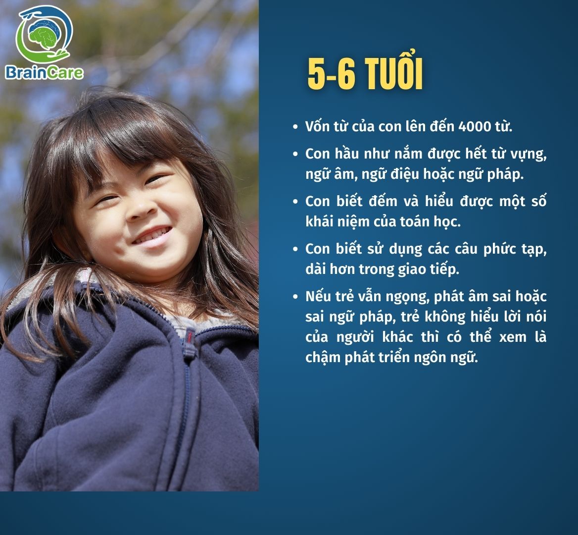 5-6 tuổi: Con hiểu được một số khái niệm toán học, và có thể sử dụng các câu dài, phức tạp hơn trong giao tiếp.
